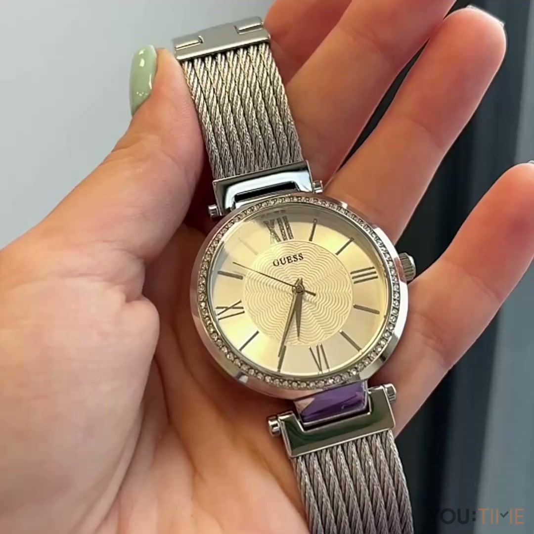 Zegarek damski Guess W0638L1 ma modną, wyrafinowaną formę. To model dla kobiet lubiących styl fashion. Koperta i bransoleta wykonane zostały ze stali, co zapewnia wysoką trwałość produktu. Świetnie się ze sobą komponują, tworząc model przejrzysty i gustowny. Wokół koperty zastosowano delikatne zdobienie w postaci kryształków. Na srebrnej tarczy umieszczono indeksy i cyfry rzymskie. Ciekawa bransoleta i jej mocowanie dodają oryginalnego wyglądu. Zegarek jest odporny na wilgoć i zachlapania (wodoszczelność 30M). Objęty jest 24-miesięczną gwarancją i zapakowany oryginalne pudełko Guess.