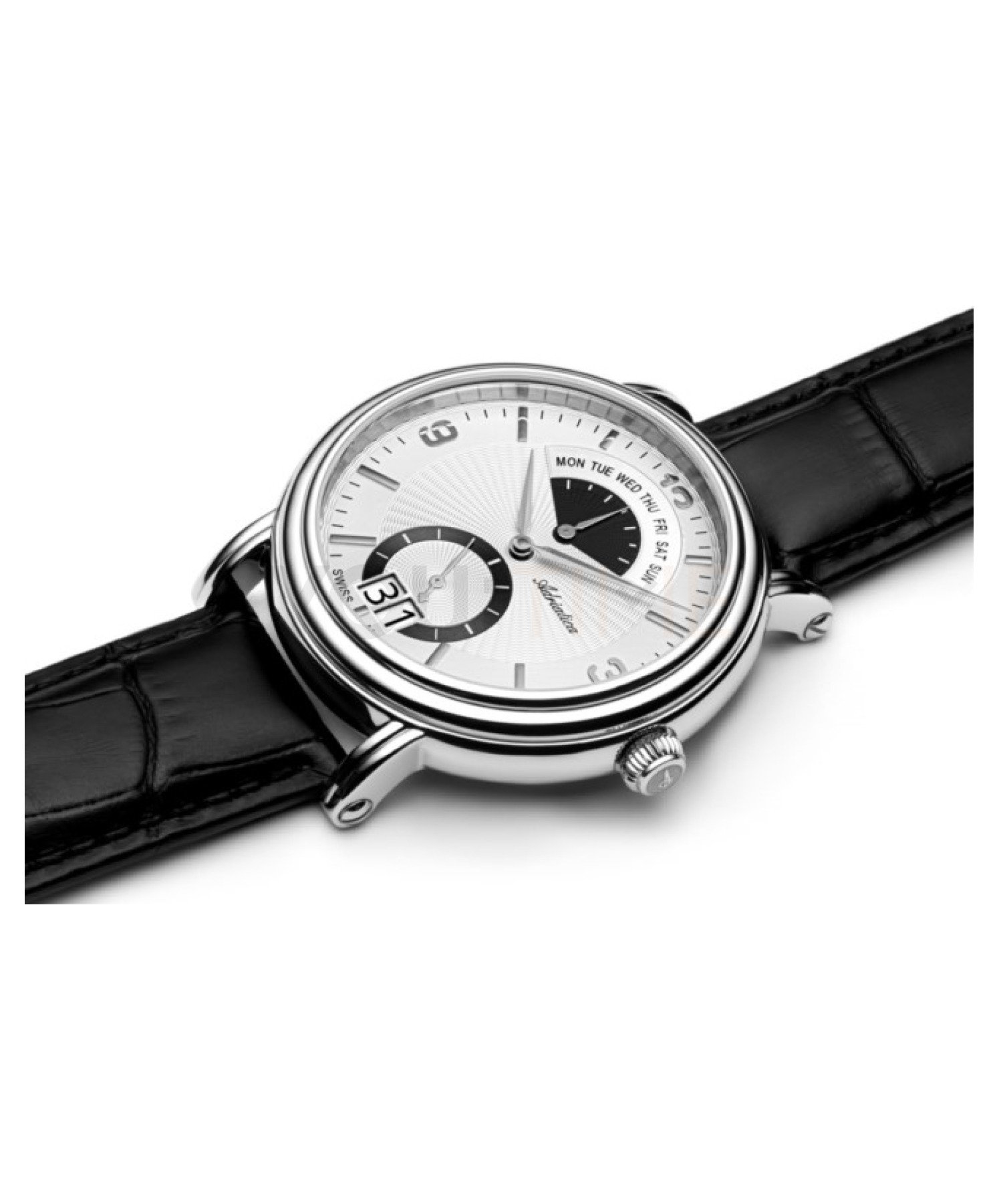 Zegarek męski Adriatica A1194.5253QF to elegancki model, którego stalowa okrągła koperta została zawieszona na czarnym skórzanym pasku. Biała tarcza została uzupełniona o sekundnik oraz datownik dni miesiąca i tygodnia. Całość przykryto niezwykle odpornym na zarysowania szkłem szafirowym. Za precyzyjne działanie odpowiada szwajcarski mechanizm kwarcowy Ronda 7004N. Wodoszczelność równa 5 ATM, chroni zegarek w przypadku większych zachlapań.