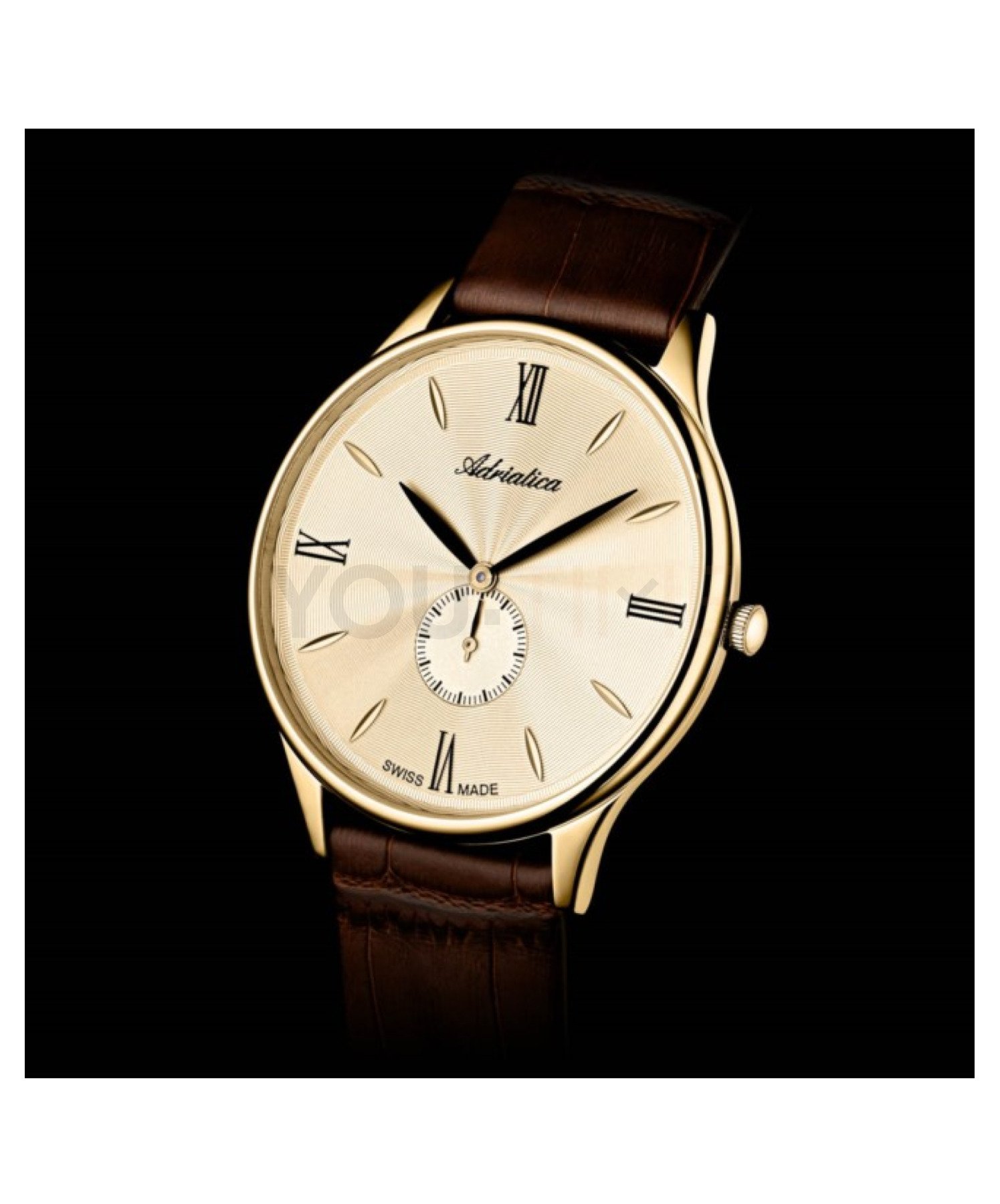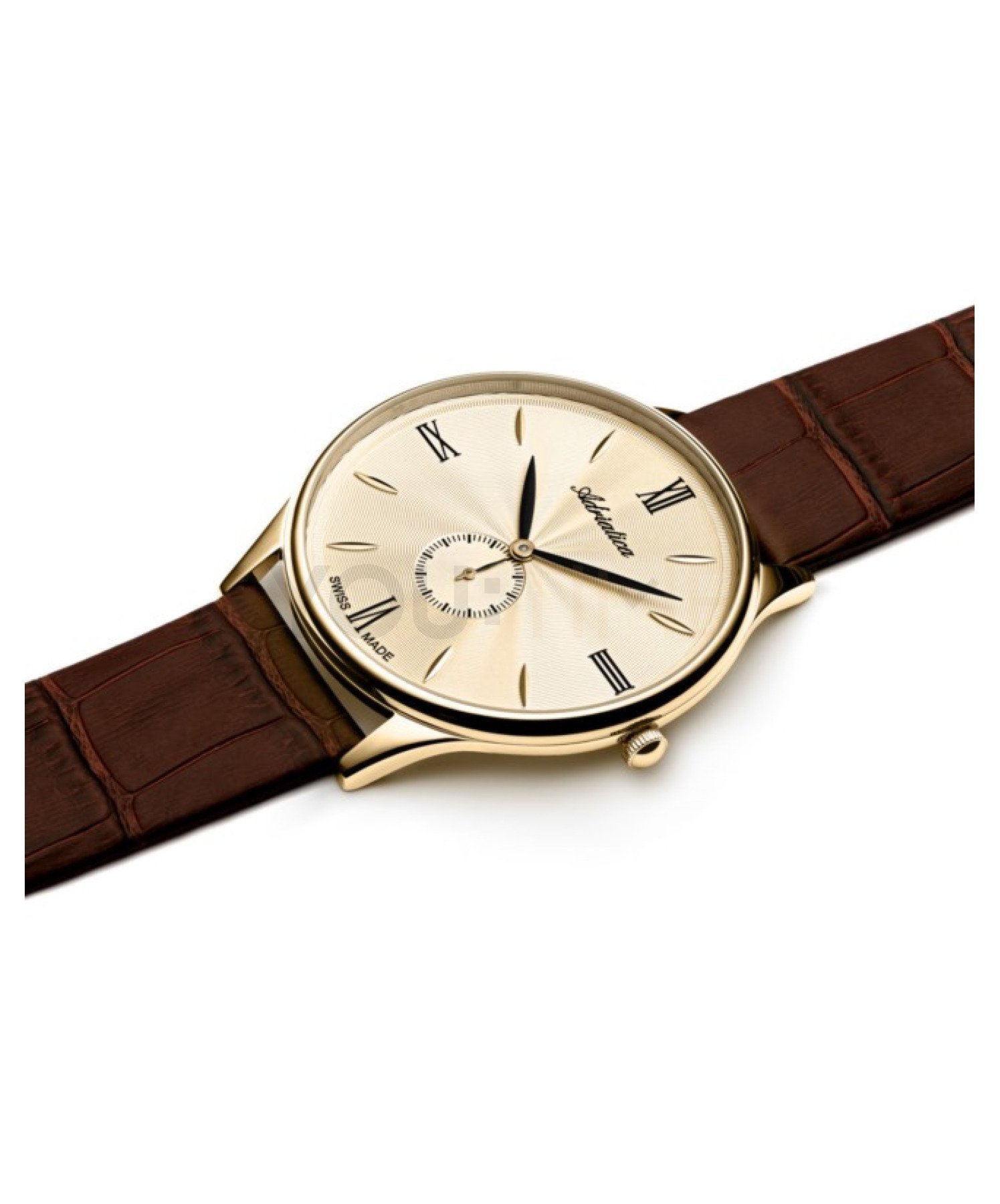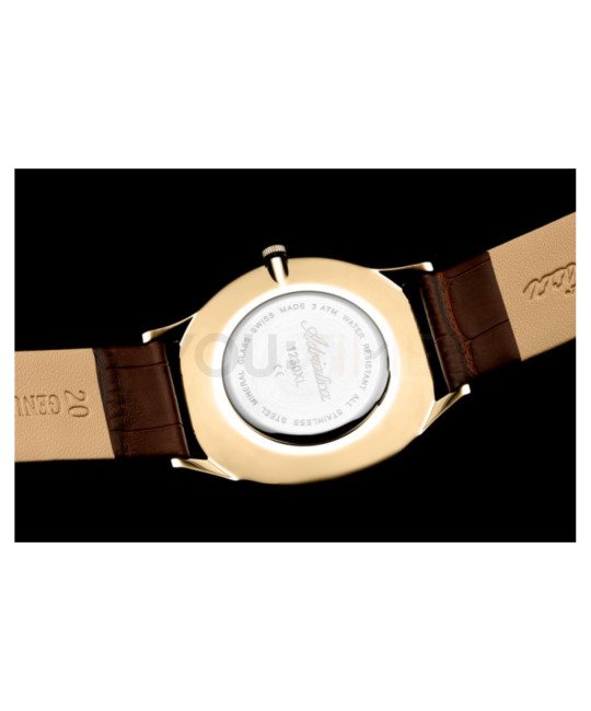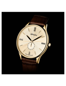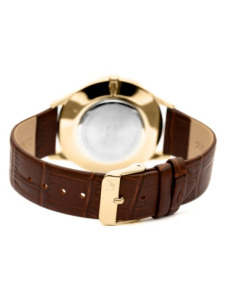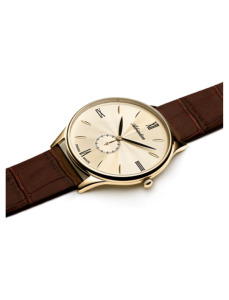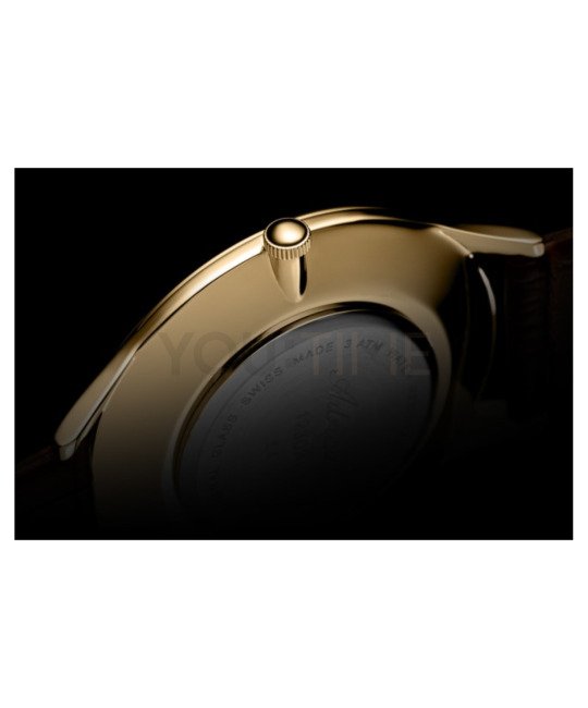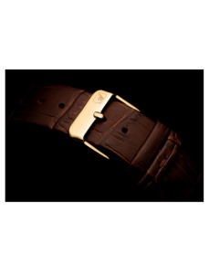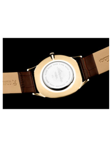 Na złotej tarczy umieszczona została mała tarcza sekundnika i wyraziste cyfry rzymskie połączone z subtelnymi indeksami. Stanowi to klasyczną kompozycję, inspirowaną dawnymi projektami zegarmistrzowskimi. Mineralne szkiełko jest elastyczne i zapewnia odporność na stłuczenia. Gwarantuje to zadowolenie z użytkowania. Kwarcowy mechanizm szwajcarskiej produkcji Eta 902 gwarantuje niezawodne działanie. Produkt charakteryzuje wodoodporność 30 m, która chroni mechanizm w przypadku niewielkich zachlapań.