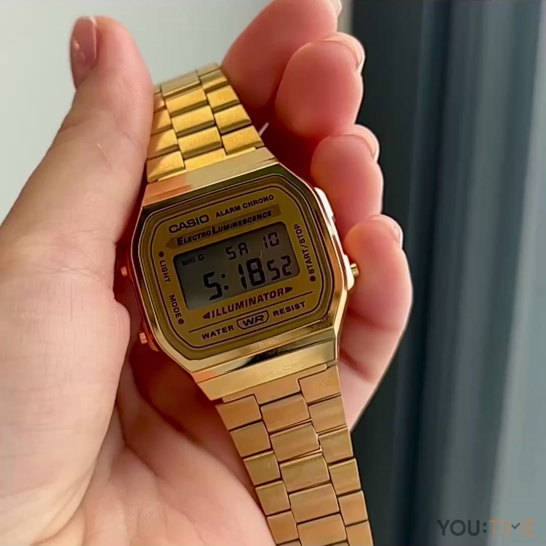 Zegarek Casio Vintage A168WG-9EF to doskonała propozycja dla aktywnych osób, które poszukują ciekawego, cyfrowego zegarka, nawiązującego stylistyką do lat 90. Prostokątna koperta w złotym kolorze została umieszczona na stalowej bransolecie o tej samej kolorystyce - ta kompozycja prezentuje się bardzo oryginalnie i ma modowy charakter. Regulowane zapięcie pozwala na szybkie dostosowanie zegarka do swoich potrzeb. Liczne funkcjonalności gwarantują zadowolenie z użytkowania. Zegarek wyposażony jest w stoper odliczający czas do 1h z dokładnością do 1/100 sekundy, alarm dzienny, kalendarz automatyczny, tryb 12- i 24-godzinny. Podświetlenie typu Illuminator gwarantuje równomierne podświetlenie tarczy, które utrzymuje się kilka sekund po puszczeniu przycisku. Bateria przy standardowym użytkowaniu może wystarczyć do 7 lat. Model jest odporny na bardzo powierzchowne zachlapania, należy unikać kontaktu z wodą. Produkt zapakowany w prezentową puszkę Casio, objęty 3-letnią gwarancją.